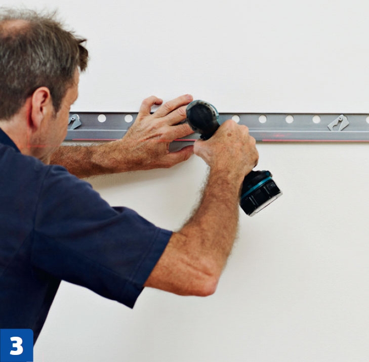 Kiilaa kisko suoraksi, jos seinissä on epä-tasaisuuksia. Kisko kannattaa kiinnittää seinään aluksi löysästi ja säätää sekä korkeus että syvyys kohdalleen samalla kertaa. On erittäin tärkeää, ettei kiskossa ole syvyyseroja.