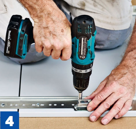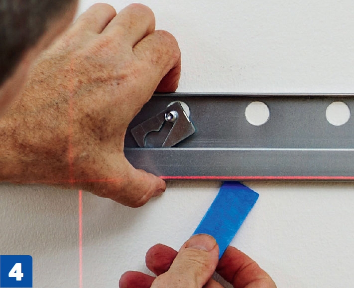 Kiinnitä kisko seinään, mutta älä kiristä ruuvia pohjaan asti. Kiskon reiät ovat ruuvin kantaa isompia, joten väliin pitää lisätä erikoislevy. Kiskon korkeus on helppo säätää sopivaksi levyjen avulla.
