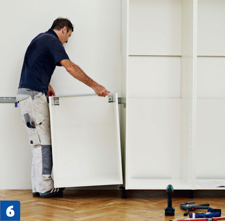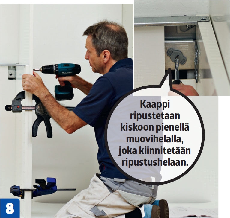 Ikea on kehittänyt kaappien ripustamiseen uuden menetelmän. Seinään ruuvataan koko kaappirivin mittainen rungonripus-tuskisko. Sokkelijalat sovitetaan kaappien alle vasta urakan lopuksi.