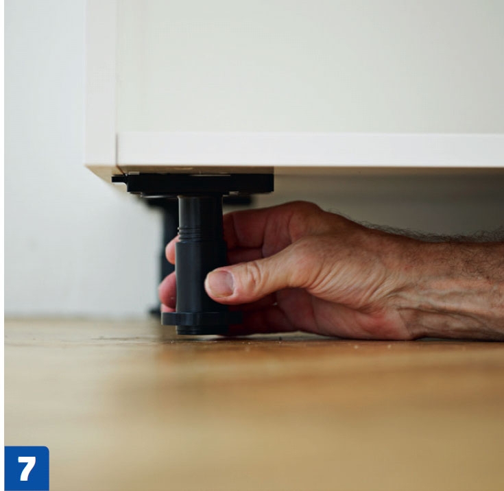 Työnnä sokkelijalat kaapin etureunan alle ja kierrä niitä pitemmiksi, kunnes kaapit ovat vaakatasossa. Jalan kiinteässä osassa on neljä tappia. Järjestelmä on joustava, sillä saman jalan päälle voi tukea kaksi kaappia.