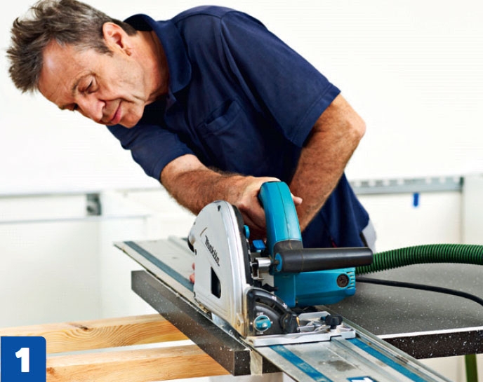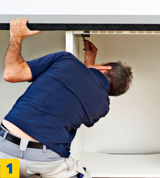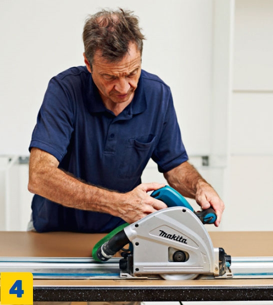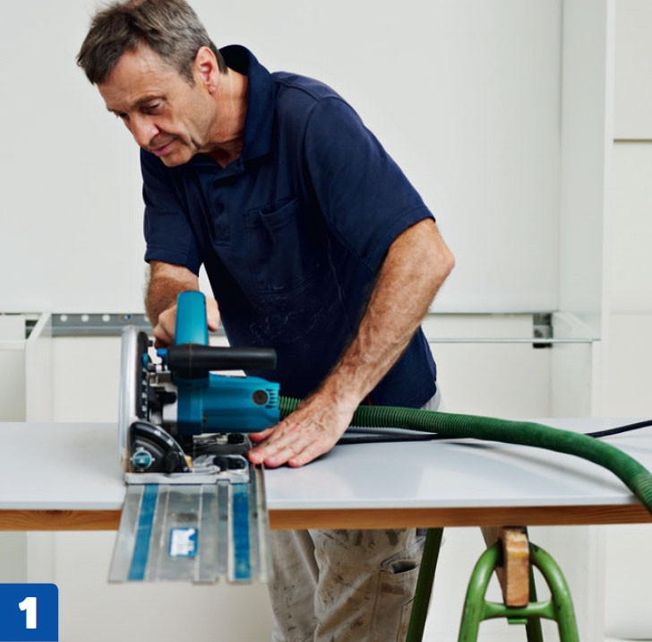 Lyhennä pöytälevy siten, että sen pää ulottuu 1-2 senttiä kaappien reunan yli. Tee levyyn aluksi vain 2-3 milliä syvä pintaviilto. Pintalaminointi pysyy parem-massa kunnossa, kun levyä ei sahata poikki kerralla.