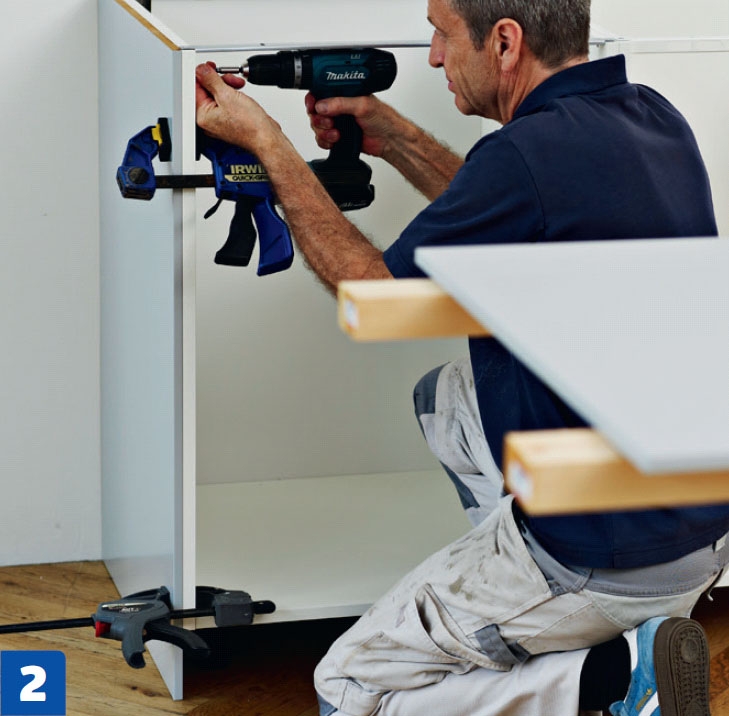 Kaappien rungot seisovat nyt seinän vieressä suorassa rivissä. On aika yhdistää kaapit saumattomaksi kokonaisuudeksi.