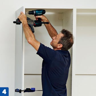 Ruuvaa ripustushelat kaappien reunoissa oleviin reikiin. Ruuvaa korkeiden kaappien ja yläkaappien helat kiinni runkoihin ennen taustalevyn kiinnittämistä.