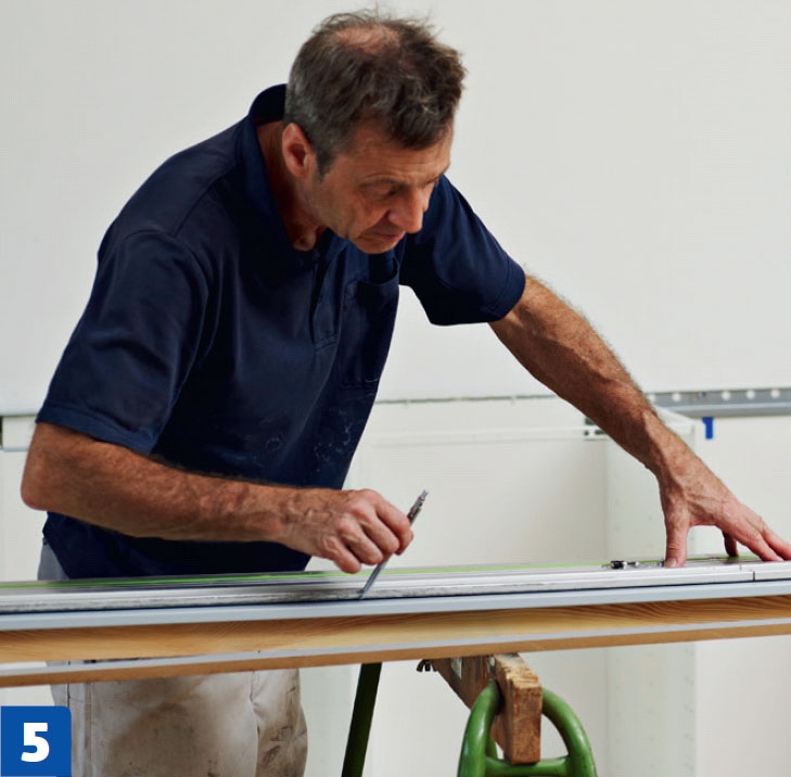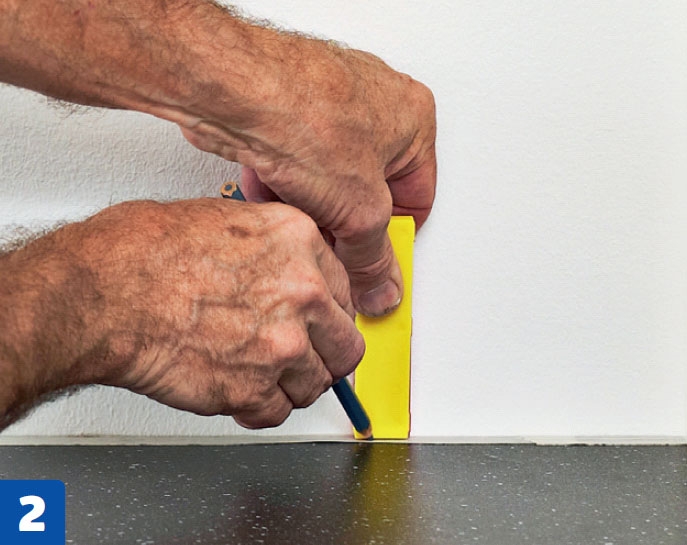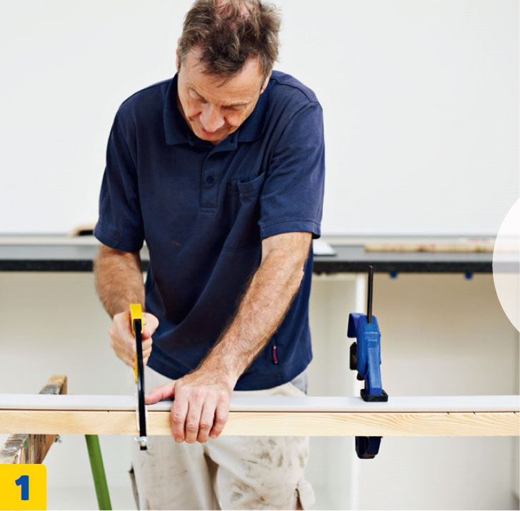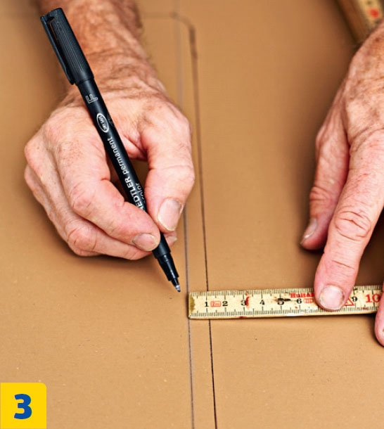 Viivat kannattaa piirtää maalarintei-pin päälle, sillä mustaan levyyn on vaikea saada kunnon jälkeä. Jos seinä on kiero, levyn takareuna pitää muotoilla pisto-sahalla. Levyn lyhentäminen onnistuu helpoimmin upotussahalla.