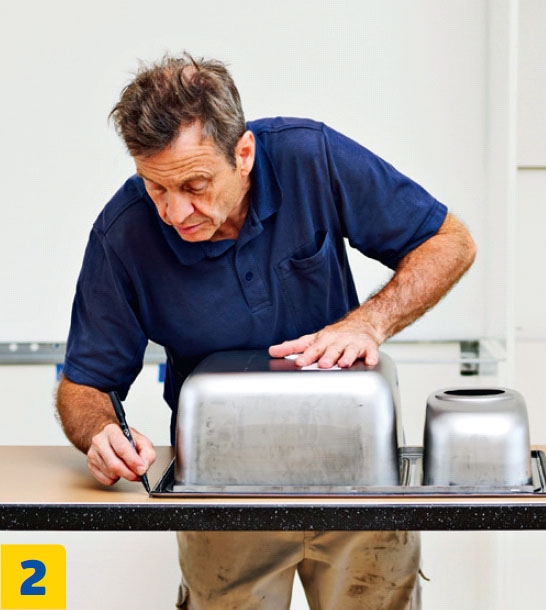 Piirrä tiskialtaan ääriviivat pöytälevyn alapintaan. Jätä altaan ja levyn etureunan väliin 45 milliä tyhjää tilaa. Altaan pitää osua tarkasti kaapin keskelle, sillä pelivaraa on vain vähän.