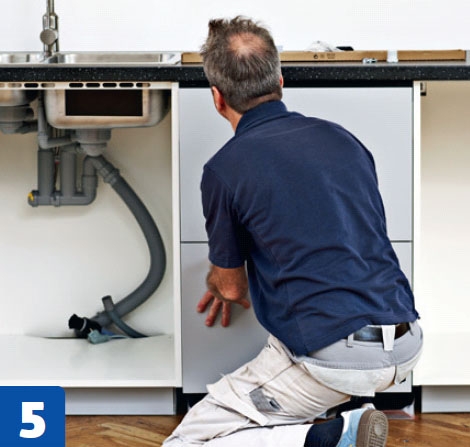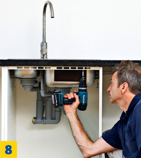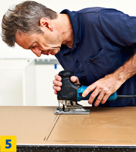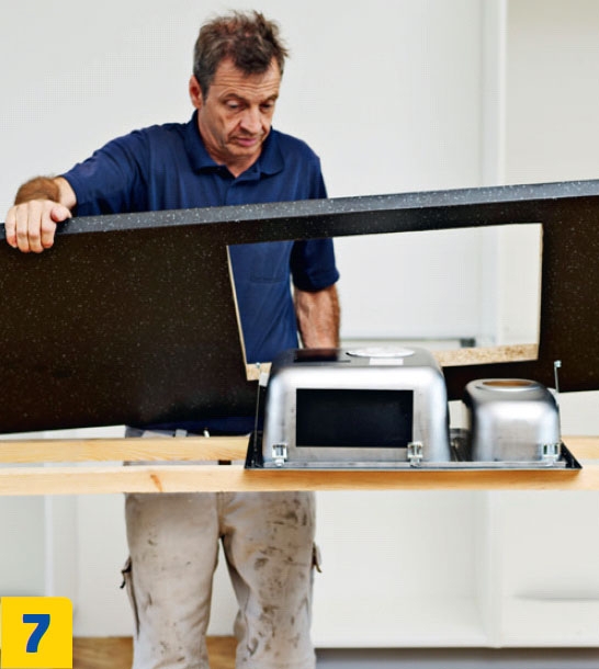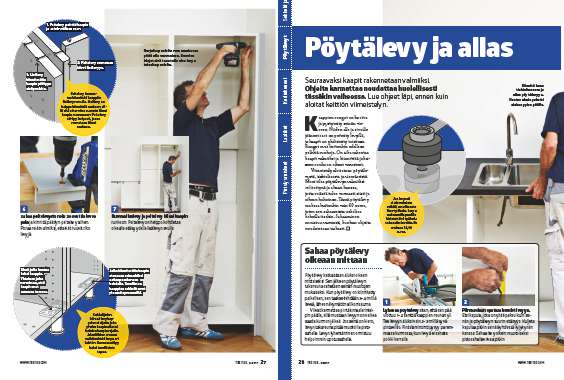 Kaikki työvaiheet kannattaa tehdä levyn nurjalta puolelta. Aseta levy ylösalaisin parin lankun päälle, jotta terä mahtuu liikkumaan vapaasti levyn läpi. Kiinnitä hana ja allas pöytä-levyyn, ennen kuin nostat levyn alakaappien päälle.