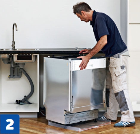 Työnnä astianpesukone paikalleen. Poistoletku liitetään myöhemmin vie-reisessä kaapissa olevaan viemäriin. Molemmissa kaapeissa on valmiit reiät.