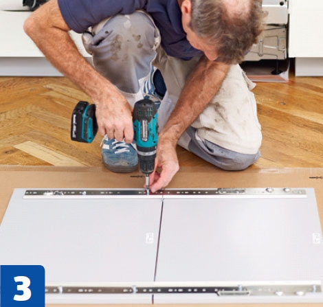 Sahaa peitelevystä sopiva pala. Käytä tiheähampaista terää, jotta sahausjäljestä tulee mahdollisimman siisti. Peitelevy on 13 milliä paksu, ja sen pinta on samaa mate-riaalia kuin kaappien ja laatikoiden ovet.