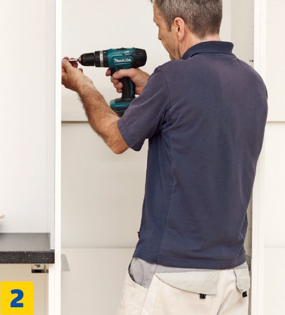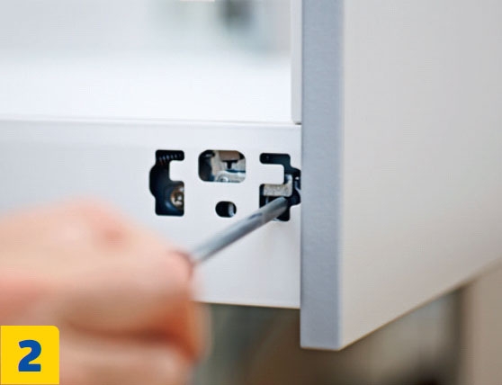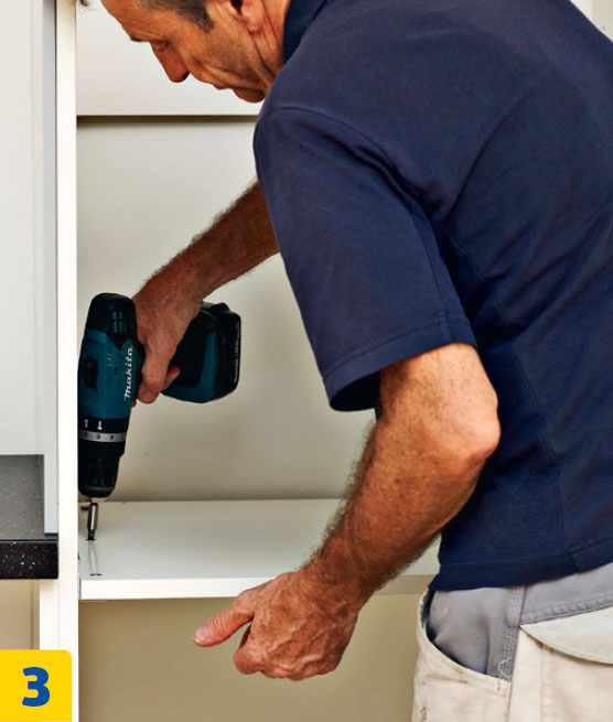 Ruuvaa uunin yläpuolisen hyllyn erikoisruuvit alhaalta päin 24. riville. Erikoisruuvit tarttuvat lujasti kiinni hyllyyn ja vakauttavat kaapin paremmin kuin tavalliset hyllynkannattimet.