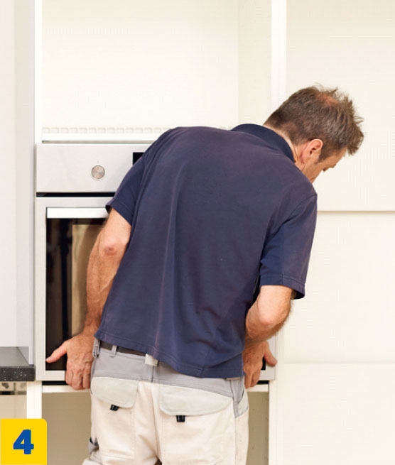 Kiinnitä uuni kaappiin. Nosta uuni alahyllyn päälle, oikaise se suoraan ja säädä uunin etureunan hyllyn tasolle kaapin molemmilta puolilta ruuvien avulla.