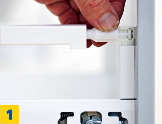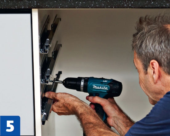 Ruuvaa uunin alapuolinen hylly kiinni kiskoihin. Jykevä ala hylly pitää uunin varmasti paikallaan ja vakauttaa samalla kaapin ra-kenteen. Asenna hyllyjen takana olevaan tuuletusrakoon ritilä.