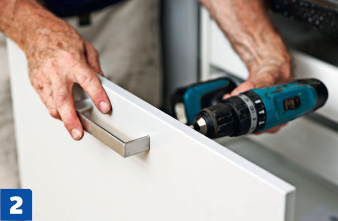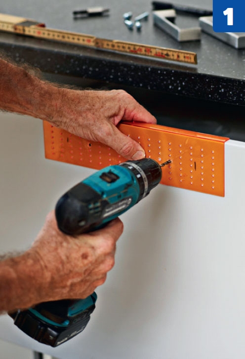 Poraa kahvojen reiät sapluunan läpi. Piirrä aluksi pieni merkki jokaisen laatikon tai oven yläreunan keski-kohtaan. Kohdista sapluunan keski-kohta merkkiin ja poraa kahvoille reiät oikeiden sapluunan-reikien läpi.