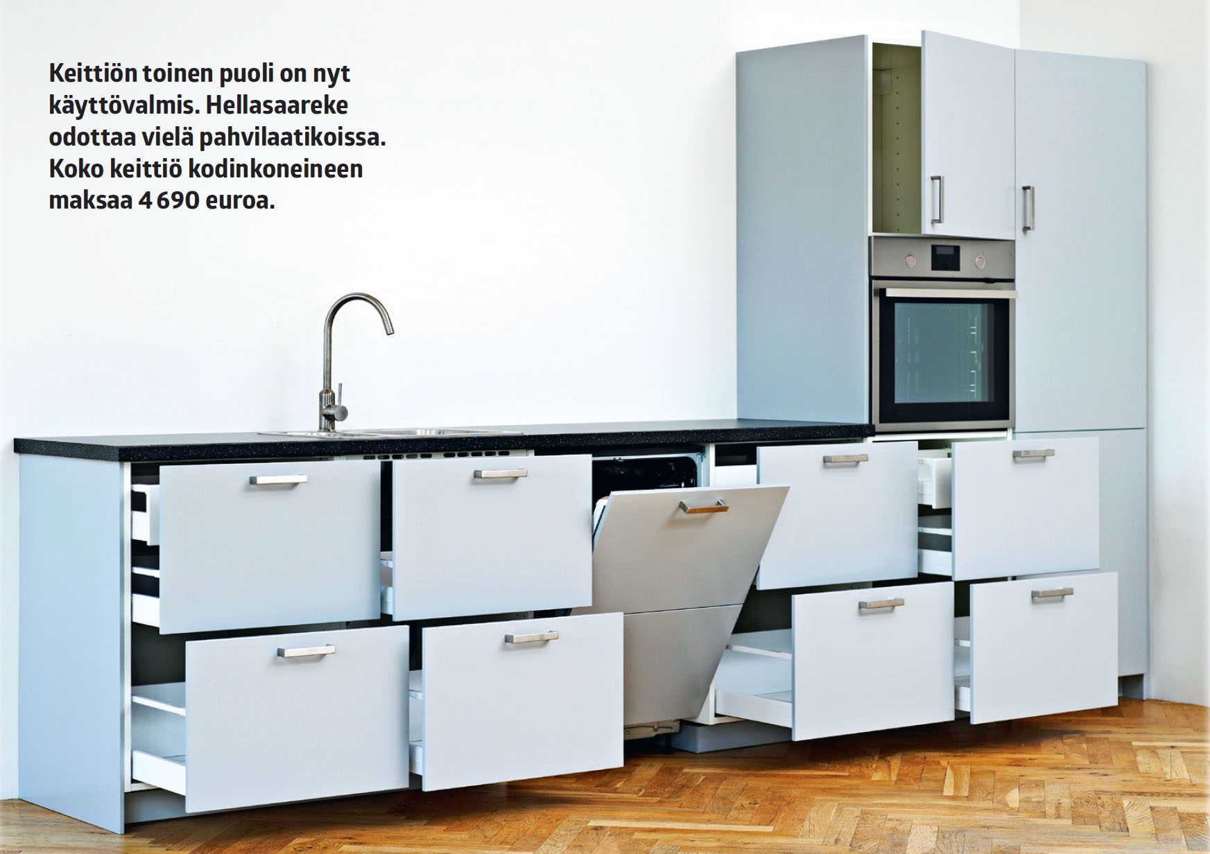 Samasta kaupasta ostatut kaapit ja koneet sopivat varmasti yhteen. Nämä koneet ostettiin Ikeasta. Se rajoittaa valikoimaa, mutta helpottaa työtä.