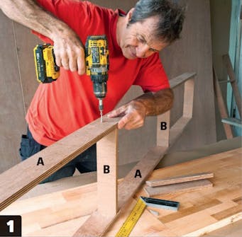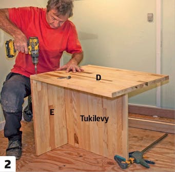 Ruuvaa ensimmäinen reuna (D) ja pohja (E) yhteen. Niistä tulee vasemmanpuoleinen pääty. Poraa ruuveille valmiit reiät, jotta puu ei halkea. Tässä käytetään kolmea 4,5x60 millin ruuvia.