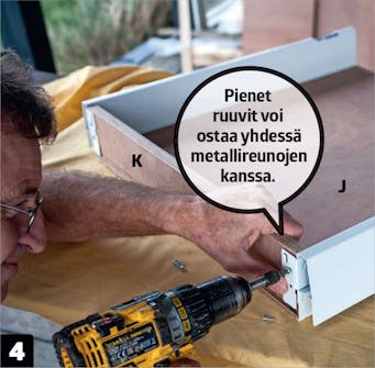 Laatikoiden pohjat ja takaosat sahataan ja yhdistetään metallireunoilla laatikoiden etulevyihin. Valmiiksi kootut laatikot asennetaan kaapeissa oleviin kiskoihin.