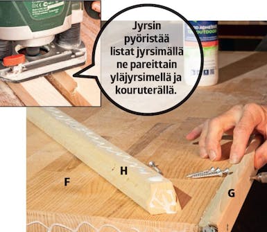 Kiinnitä takareunan listat (G ja H) levyyn liimalla ja 4,5x40 millin ruuveilla. Sahaa listojen päät 45 asteen kulmassa, jotta nurkista tulee siistit. Muista porata ruuveille valmiit reiät, jotta listat eivät halkea.