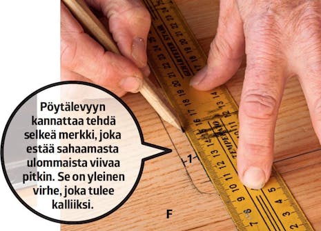 Piirrä uusi viiva edellisen sisäpuolelle yh-den sentin päähän. Altaan reikä sahataan sen mukaan upotussahalla ja pistosahalla.