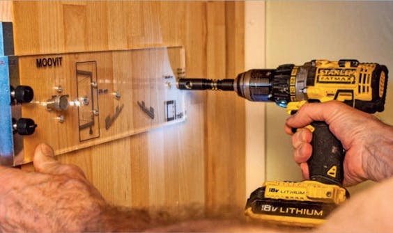 Kiskojen reikien poraamiseen kannattaa ostaa Häfelen porausohjain, jotta reiät osuvat tarkasti oikeisiin kohtiin. Ohjaimen mukana tulee syvyysrajoittimia.