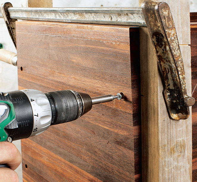 Liitokset lukitaan ruuveilla sivuilta varmuuden vuoksi. Se voisi näyttää rumalta, mutta siitä tulee upea yksityis-kohta, sillä ruuvit (5 x 80 mm) peitetään 12 mm:n puutulpilla. Esiporaan 3,5 mm:n poranterällä ruuveille reiät.