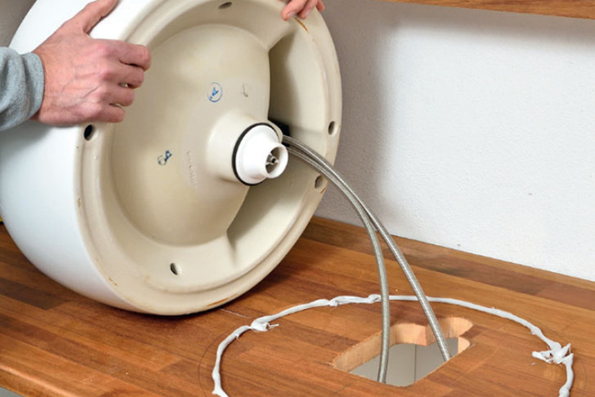 Nosta allas reiän päälle, ja piirrä sen paikka pöytälevyyn. Nosta allas syrjään ja asenna vesihana. Pursota viivan päälle silikonia ja paina allas takaisin.