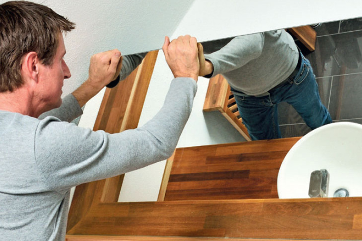 Liimaa peili seinään asennusliimalla. Levitä liima silikonipistoolilla. Tämä peili asennetaan hyllyn päälle. Paina peili varovasti kiinni seinään ja varmista, että se tarttuu kiinni liimaan.