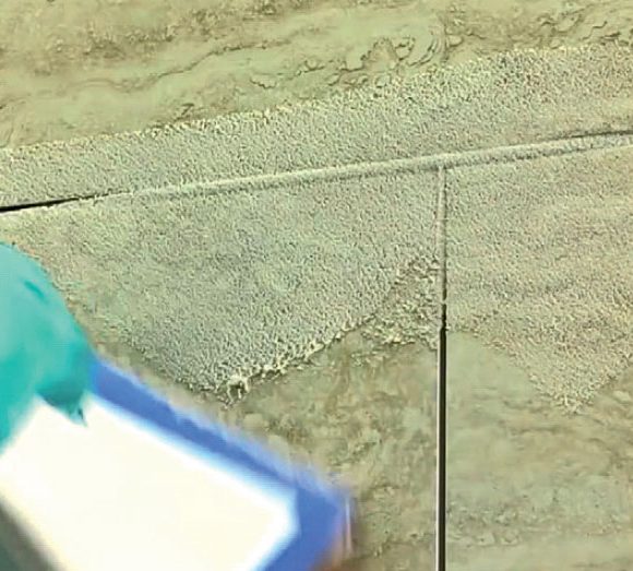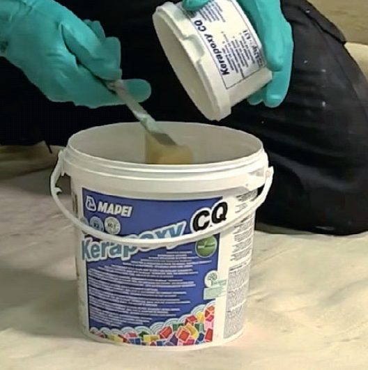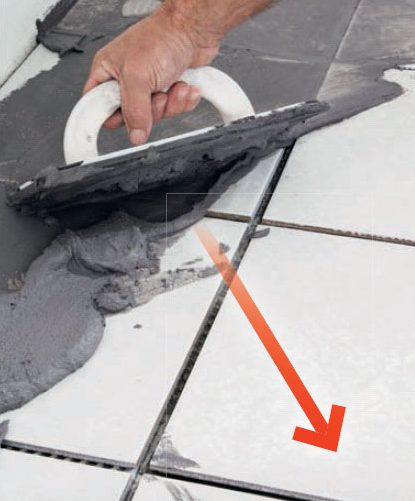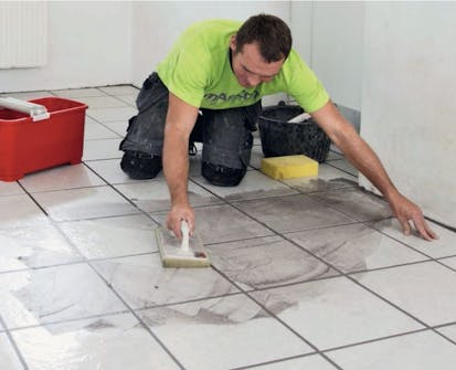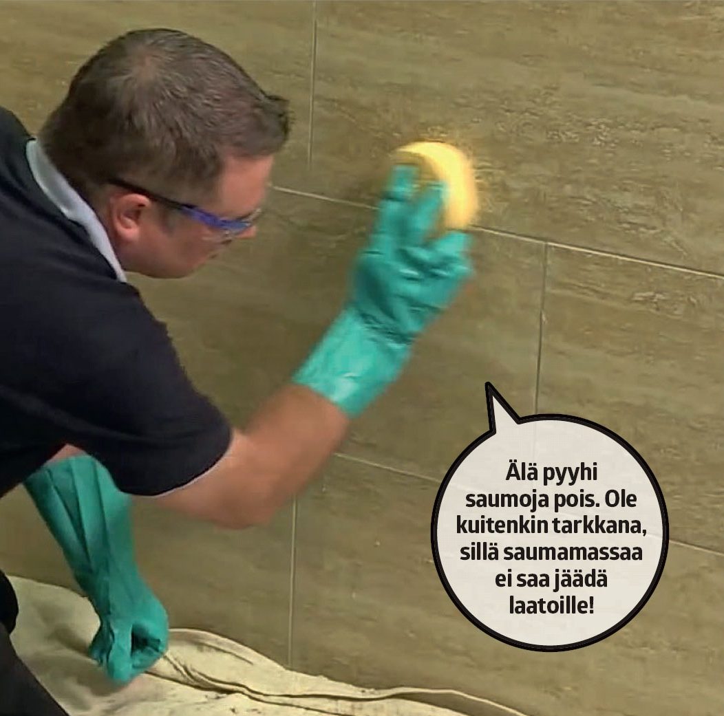Levitä saumamassa hiertimellä. Paina massa kunnolla kaikkiin saumoihin. Kääntele hierrintä siten, että massaa menee joka paikkaan. Poista ylimääräinen epoksi laattojen päältä vinoilla vedoilla, jotta pois pestävää massaa jää mahdollisimman vähän.