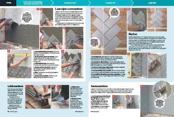 Aloita laatoittaminen alanurkasta ohjain rimojen vierestä. Paina laatat lujasti kiinni laastiin. Käytä saumoissa laattaristejä tai muita välikapuloita.