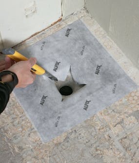 Tiivistä lattiakaivon ympärys synteettisellä kumikauluksella. Pohjusta betoni sinisellä pohjusteella ja poista rasva lattiakaivon metallireunasta. Leikkaa aukko lattiakaivon kohdalle.