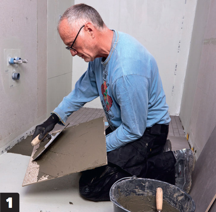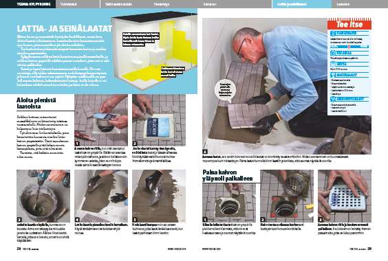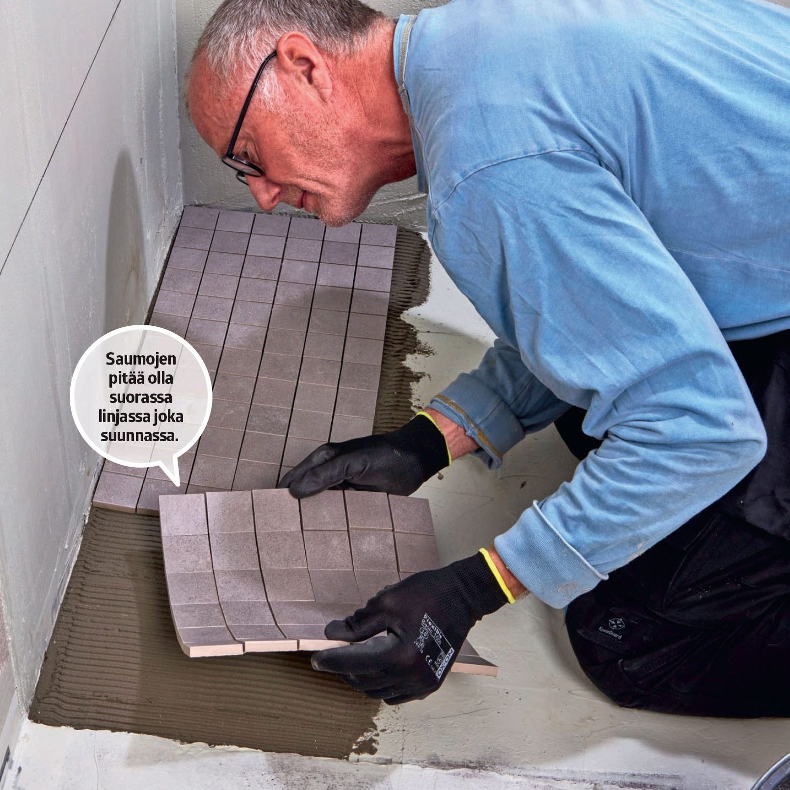 Tässä jutussa laatoitetaan ensi lattia, koska laatat ovat isoja. Sen jälkeen seinälaatat voi asentaa alhaalta ylös.