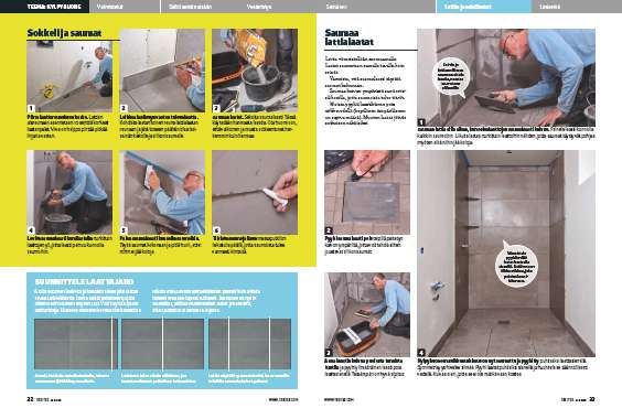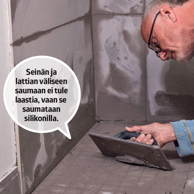 Lattia viimeistellään saumaamalla. Laatat saumataan samalla tavalla kuin seinät.
