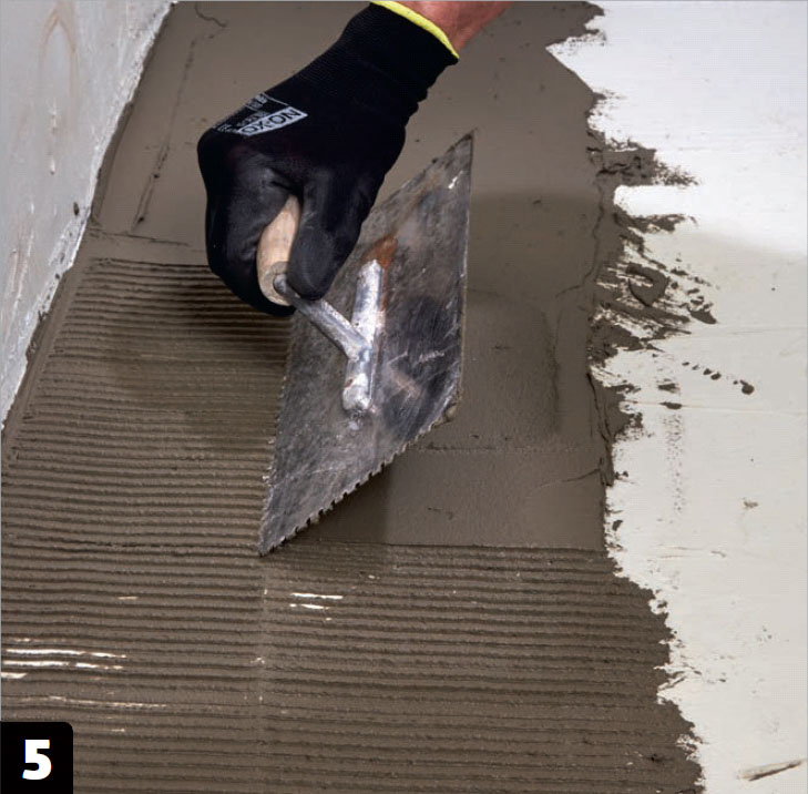 Vedä laastikampaa noin 60 asteen kulmassa, jotta laasti leviää tasaisesti, kun laatat painetaan kiinni laastiin.