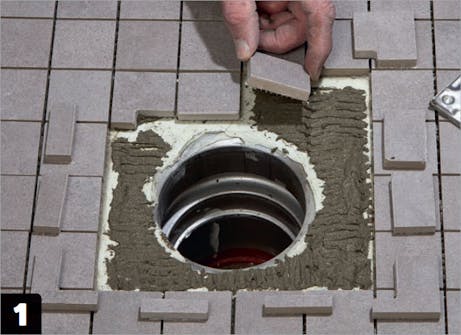 Työ aloitetaan koelaatoituksella, jossa kiinnitetään huomiota etenkin lattiakaivon ympäristöön. Tässä tapauksessa kaivon ympärille pitää leikata monta laatanpalasta, jotta siitä tulee siisti.