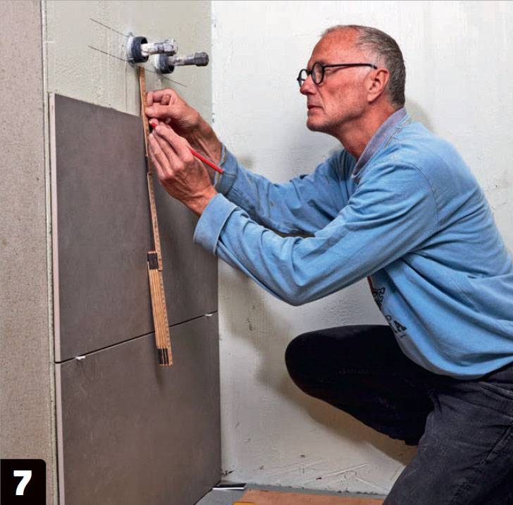 Mittaa hanan paikka. Ota mitta alla olevan laatan päältä, ja lisää mittaan sauman leveys. Ota sivumitat viereisestä seinästä.