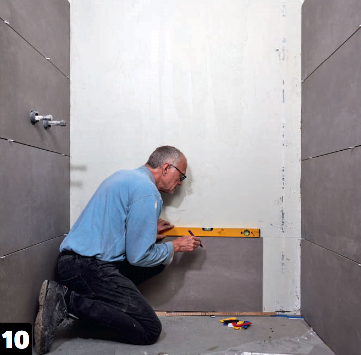 Sitten seinät. Aloita suihkutilan laattojen asentaminen piirtämällä seinään viiva lasiseinän kohdalle.