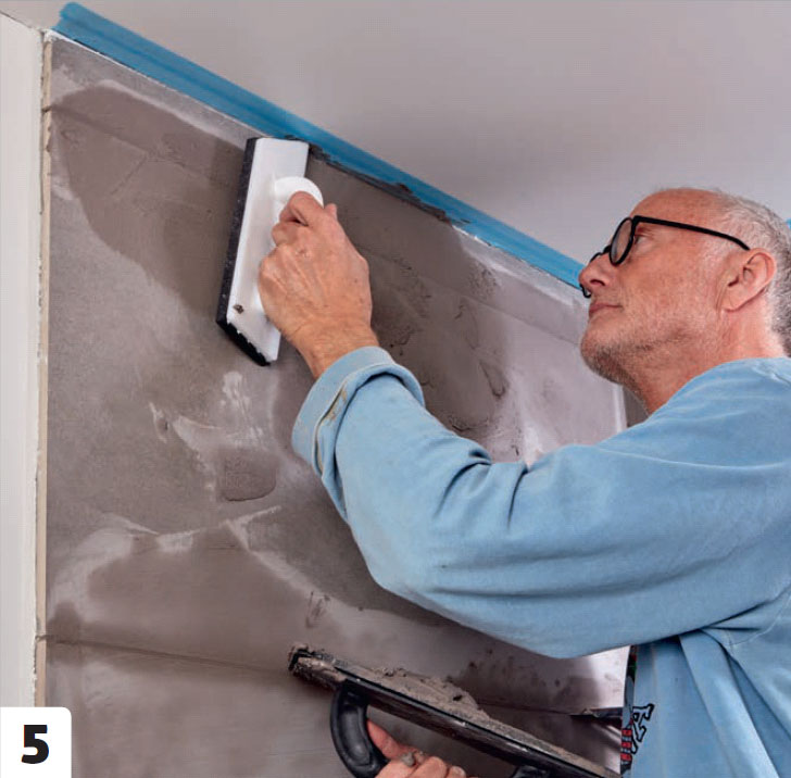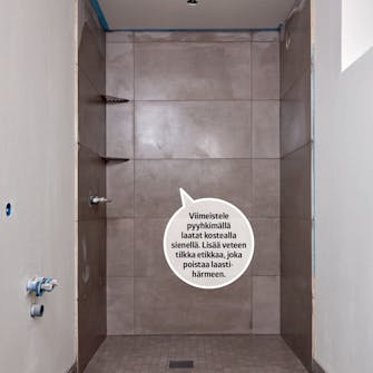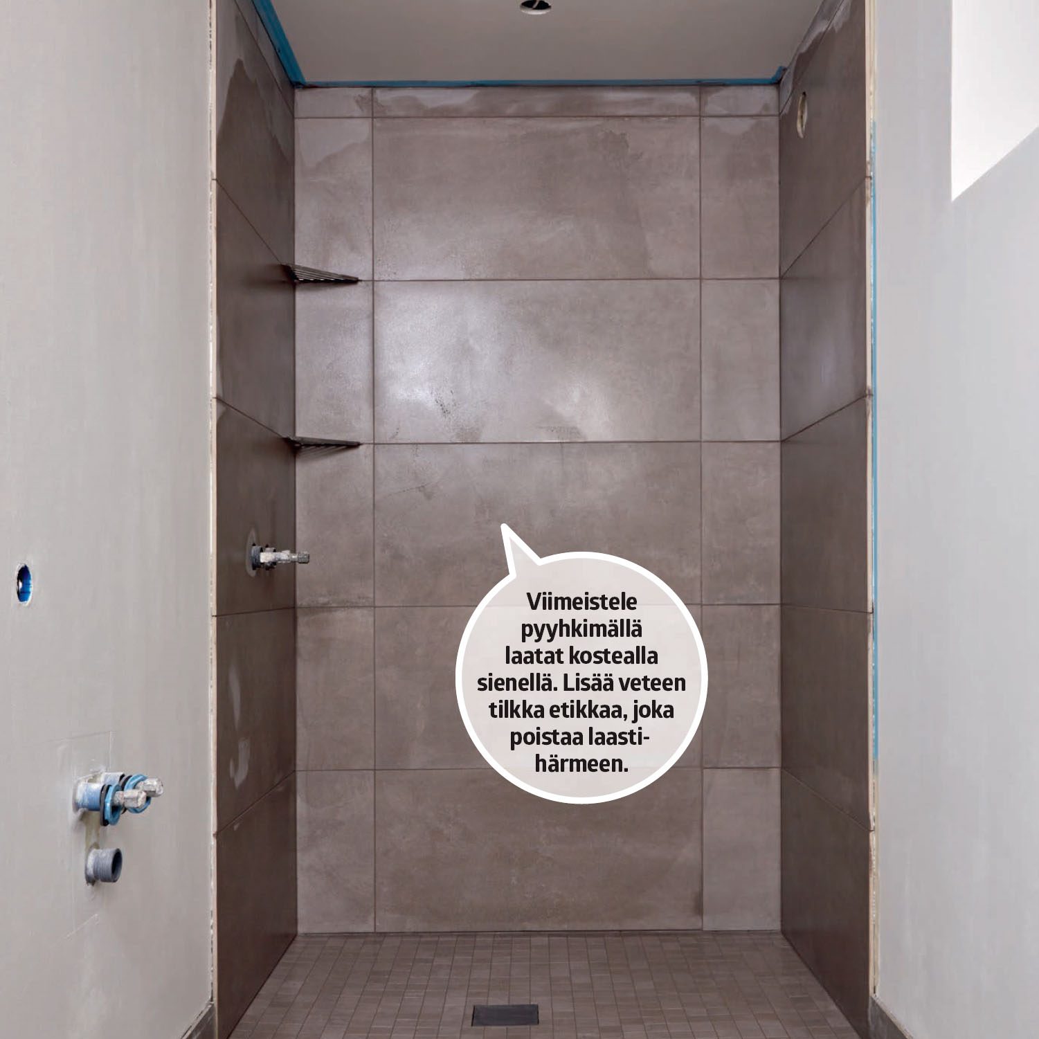 Anna laastin kuivua puolesta tunnista tuntiin ja pyyhi ylimääräinen laasti pois laattasienellä. Telaämpäri on hyvä sijoitus.