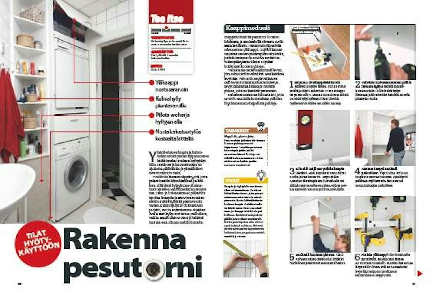 Kaappimoduuli tai pesutorni koostuu kehikosta, ja sen keskellä olevasta ovelli-sesta laatikosta. Pesutornin yläpuolelle rakennetaan yläkaappi. Projekti kannattaa jakaa useaan pienempään tehtävään, jos kokonaisuus on saatava sovitettua vaikeapääsyiseen tilaan. Lopuksi kaikki osat kootaan yhteen.