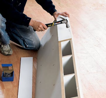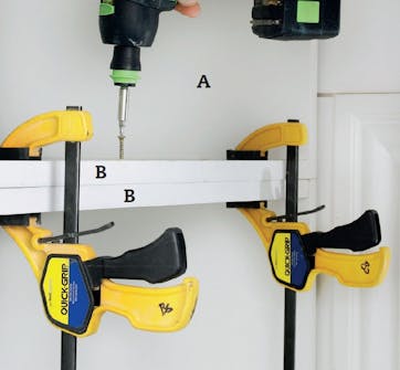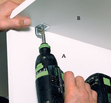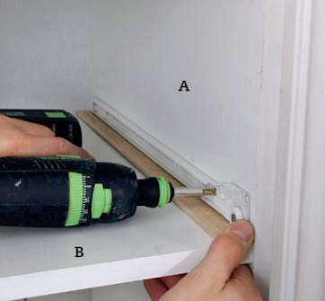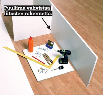 Vahvista kuivausrummun päälle tulevaa hyllyä neljällä kaluste-kulmaraudalla. Lisäksi kaikki hyllyt liimataan ja kiinnitetään kahdella ruuvilla jokaiselta sivulta.