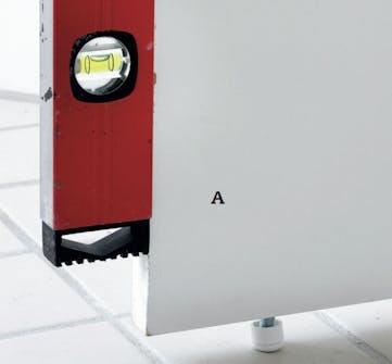 Kiinnitä neljä 8M-pulttia kaapin jaloiksi. Näin levyt eivät asetu lattiaa vasten ja ime kosteutta. Levyn sisään ruuvatun kierretapin avulla moduulia voi säätää asennusvaiheessa siten, että se aset-tuu vaateriin. Varusta pultit muovitulpilla.