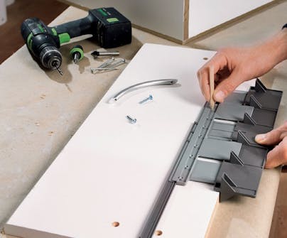 Merkitse vetimen paikka laatikon etulevyyn. Tässä on käytetty GripAlign-nimistä kaavainta apuna. Ensin asennetaan etäisyys pystysuorasta reunasta ja sen jälkeen etäisyys pohjasta. Merkitse reikien paikat lyijykynällä vetimen mukaan.
