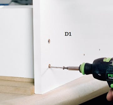 Esiporaa sivukappaleisiin reiät ylälevyä ja hyllyä varten. Poraa 5 mm:n terällä ja säilytä vähintään 7 cm:n etäisyys levyn reunoihin. Muussa tapauksessa riskinä on, että hyllyt halkeavat, kun kiinnität myöhemmin niiden reunoihin ruuveja.