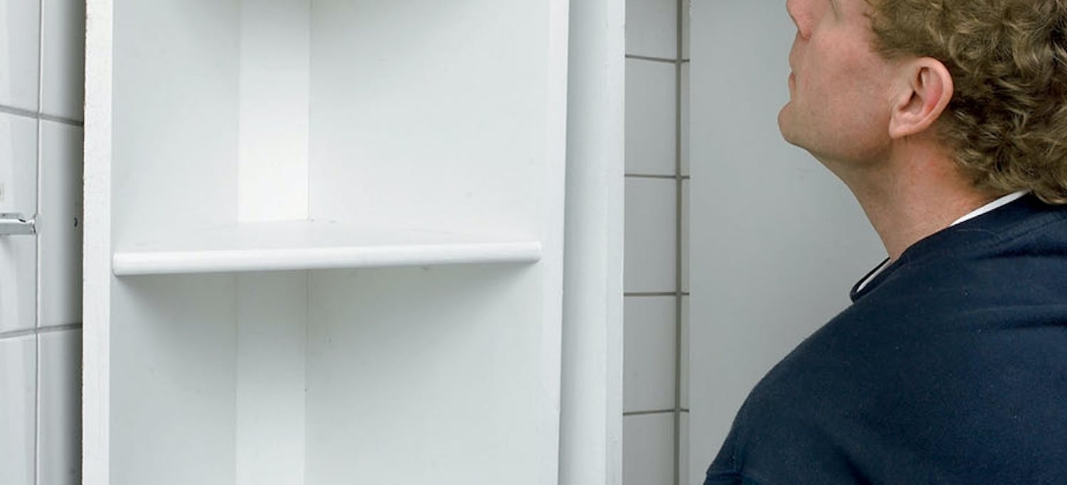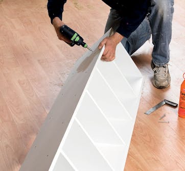 Kulmahyllykkö vaatii jonkin verran mittaamista. Jos sinulla on tuuria, seinäsi ovat suorat, ja tällöin riittää, että otat vain kulmamitat ja asennat kaksi sivukappaletta paikoilleen ja niiden väliin kolmionmuotoiset hyllylevyt.