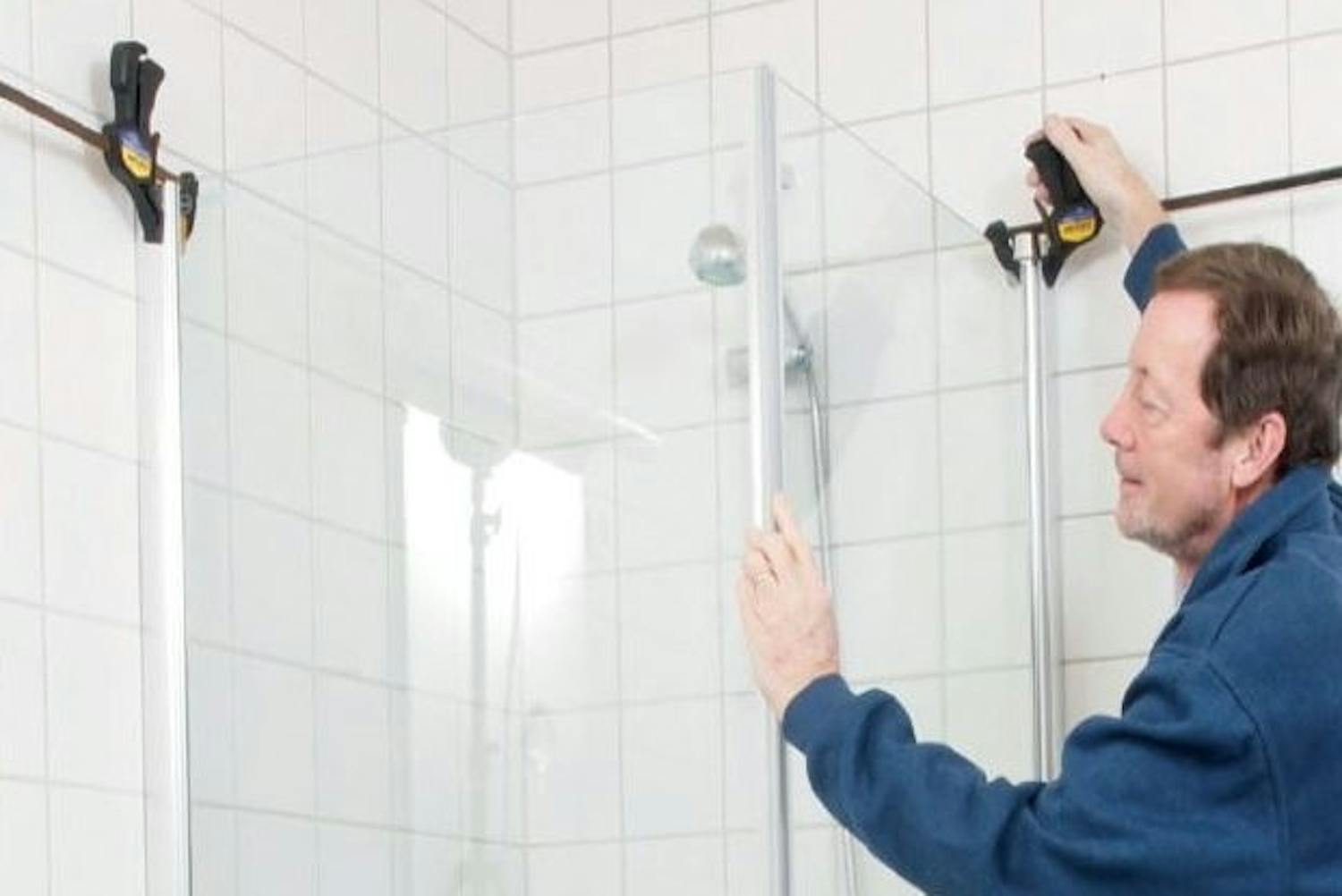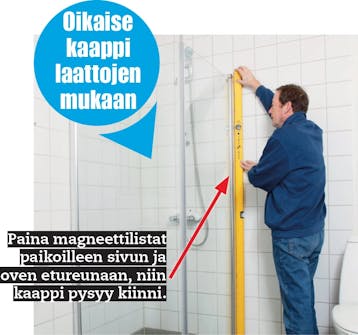 Leikkaa muovikiilat ja sijoita ne seinäprof ilien alle, jolloin saat seinän ja oven kiilattua väliaikaisesti paikoilleen. Lasi pitää nostaa irti lattiasta, sillä se ei voi levätä suoraan laattojen päällä, eikä ovi tällöin edes aukeaisi.