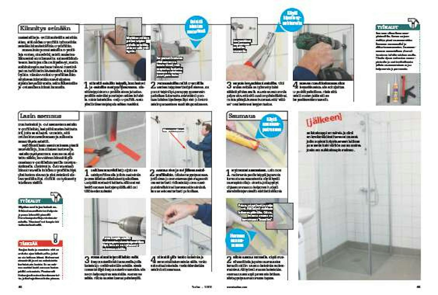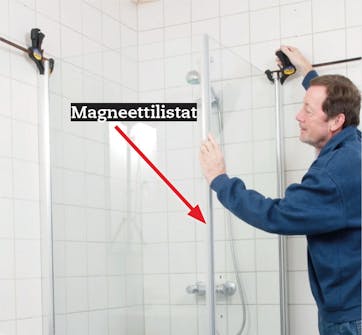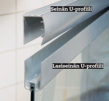 Kun lasiseinä ja -ovi asennetaan seinän U-profiileihin, lasi pitää nostaa lattiasta irti, jotta se ei hajoa. Varmista, että ovi mahtuu avautumaan ja sulkeutumaan täysin esteittä.