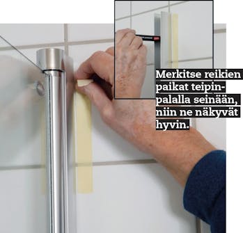 Kiinnitä seinään teippiä, kun lasiovi ja -seinäke ovat pystysuorassa. Kiin-nitä teippi aivan U-prof ilin eteen ja taakse, prof iliin valmiiksi porattujen reikien kohdalle. Poista lasiseinäke, -ovi ja U-prof ilit. Aseta ylimääräinen teipinpala reikien merkiksi.
