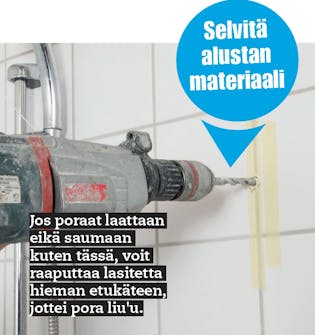 Ennen kuin poraat seinään U-profiileja varten, ota selvää, mistä materiaalista seinä on rakennettu. Esimerkkikohteessa laattojen alla on kipsilevyt, mutta suihkukaapin mukana tulevat ruuvitulpat on tarkoitettu kiviseinään, ei kipsilevyihin. Tämän vuoksi U-profiilien kiin-nitykseen käytetään ruuvitulppien sijasta levyankkureita. Näin lasiseinäke ja -ovi saadaan kiinni kunnolla.