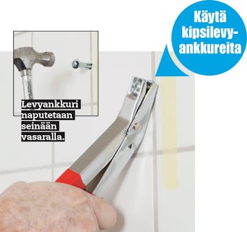 Naputa levyankkuri seinään. Tätä ennen reikään on työnnetty kaksi väkästä pihtien avulla. Ruuvia ruuvataan niin paljon ulos, että siitä saadaan pihdeillä kiinni. Purista pihtejä, kunnes huomaat, että "väkäset" ovat levinneet levyjen taakse.