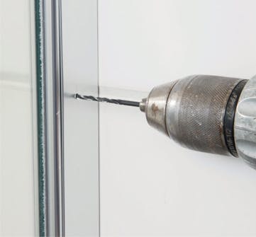 Poraa alumiiniprofiileihin reiät itseporautuville lukitusruuveille, joilla lasiseinä ja -ovi kiinnitetään seinään. Sivele rasvaa tai öljyä itseporautuviin ruuveihin, niin ne on helpompi ruuvata sisään. Asenna ne reikiin. Piilota ruuvien kannat peitelevyillä.