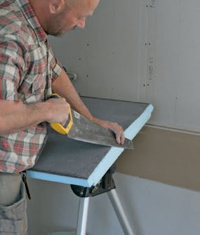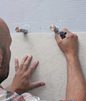 Seinän verhoileminen Wedi-levyillä ja kosteussuo-jaus on helppoa. Jos olet jos-kus asentanut kipsilevyjä, menetelmä on tässä lähes sama lukuunottamatta muu-tamien erikoisruuvien ja -helojen käyttöä. Koolauksen voi asentaa 60 cm:n mitoituksella, mikä sopii hyvin 60 cm leveille levyille.