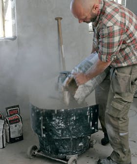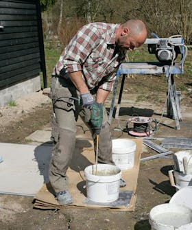 Sekoita laattalaasti laastisekoittimella tai, kuten tässä, porakoneeseen kiinnitetyllä vispilällä. Älä sekoi-ta liikaa yhdellä kertaa, sillä laas ti on käytettävä tuoreena.