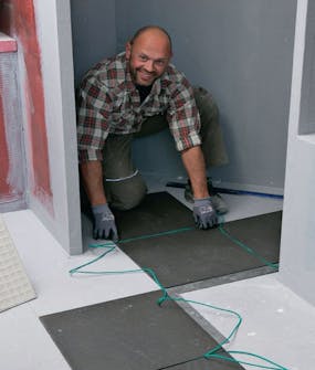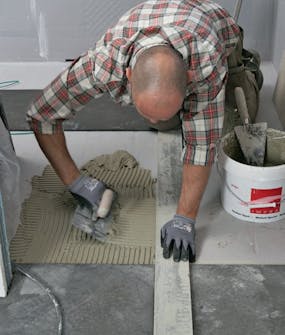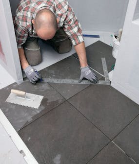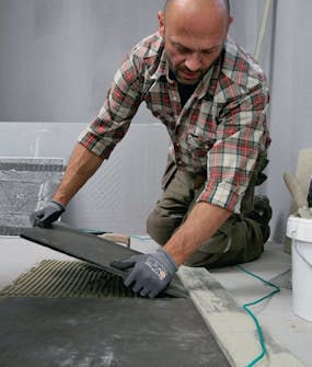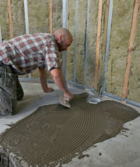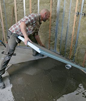 Levitä laattalaasti levytettävälle lattiaalalle. Levitä tasainen kerros ja lanaa se 8-10 mm:n hammaslastalla. Levitä laastia myös kulmiin, ja varmista, että katat laastilla koko lattiaalan.